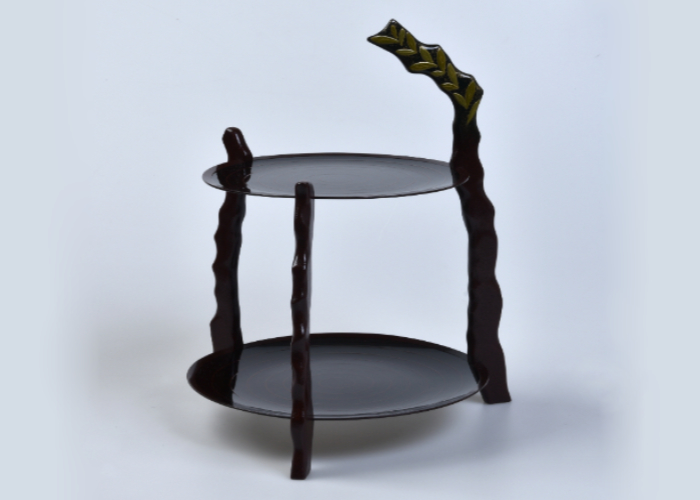 世界は戦争の中にあり、軍拡は進み、支配的な大国が権威を振るい、日本は疲弊し、息苦しい時代を生きる私たちは、人生を根本から切り倒されるような経験をします。しかし、根っこに輝く命を持っている人は、倒されてもまた復活します。私自身のキリスト信仰から来る希望と確信を【蘖】で表現しました。これからも香川漆芸の伝統を守りつつ、新しく美しく心に響く様な作品を作らせて頂きたいと思います。