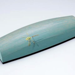 作品の外観は、 迅速に飛ぶギンヤンマを、漆らしい漆黒の中に浮かび上がるように、 金の蒔絵で表現しました。 箱の内側には、蓋の内に大空で競う2匹の雄の姿を、 身の内側には水辺を飛ぶ雌を、どちらも逆蒔絵で表現しています。