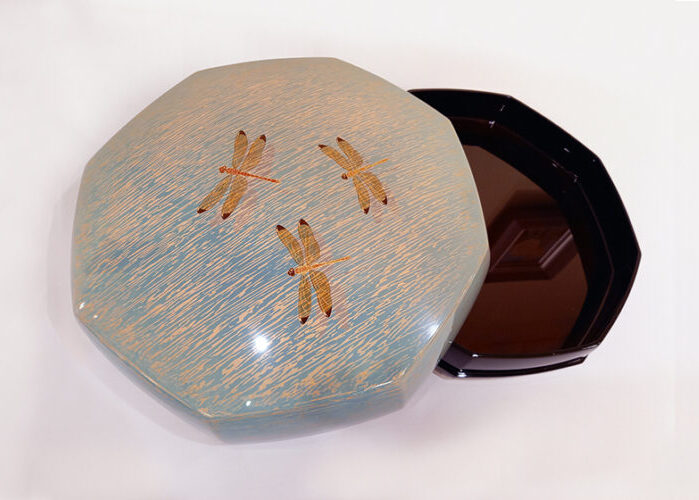 作品全体は、2色の水色漆を刷毛で塗り、松の葉を束にした特殊な櫛で塗り面を引掻き、凹凸を作り、白い漆を埋め込み、平滑に研ぎ出して、水辺を表現しています。赤とんぼ(コノシメトンボ)は、本体は赤色漆に金蒔絵。羽は透き漆を薄く塗って、透明感を出して表現しています。