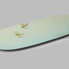 少年の頃、夏が来れば水辺を旋回して飛び回るギンヤンマを追いかけていました。作品制作にあたり、その同じ場所で取材をし、また、新しい発見はないか、少年の頃と違う目線も意識しました。そうして発見したのが、水面に映るギンヤンマの影でした。この表現により、漆の平面が立体となって、自分が感動したことをより表現出来たと思います。